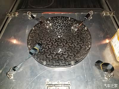 全尺寸轮胎安装效果 在障板的轮毂投影轮廓周边设计了四个绑带固定用吊耳。