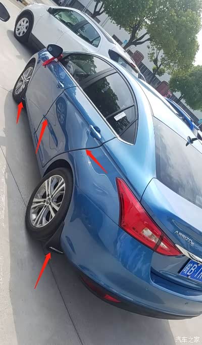 这里就是挡泥板,天天早上洒水车一洒水,门上面又是水又是泥的。挡泥板上的那标志是反光的。新车刚来第一天,孩子就把门撞了两次,没办法上了防撞条,这种是直接卡在门上的, 不用胶贴。买了5米,把前门垂直的和后门全包上刚好够。要是你想多包点就买10米吧