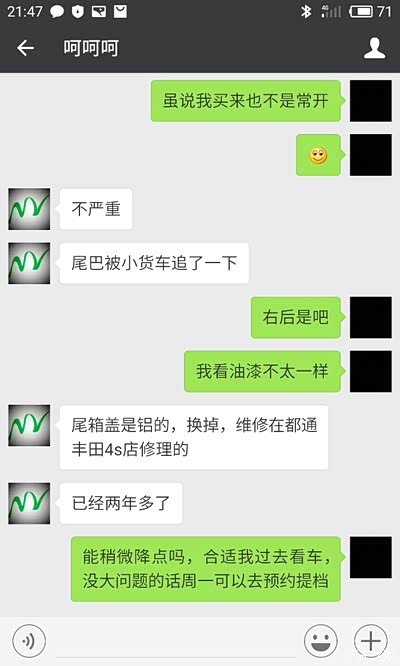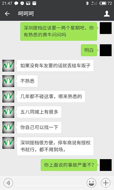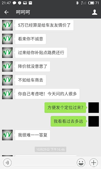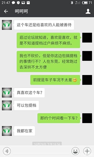 。谁知道第二天就杀出了程咬金,有人也看上此车了,并且愿意加价购买,车主也开始动摇了,提出说外迁要2个星期很久,出给这个深圳有指标的人就快很多(这个我是认同的,问题是我去看车之前已经知道我要外迁啊,看车前微信聊天里我也说过外迁可能需要一两个星期,当时为什么不说等不了呢)。虽然当晚车主颇有微词,但是并没有违约,我也提出了一些见解和解决办法。我觉得既然我给过定金了,应该就没有问题了吧?!