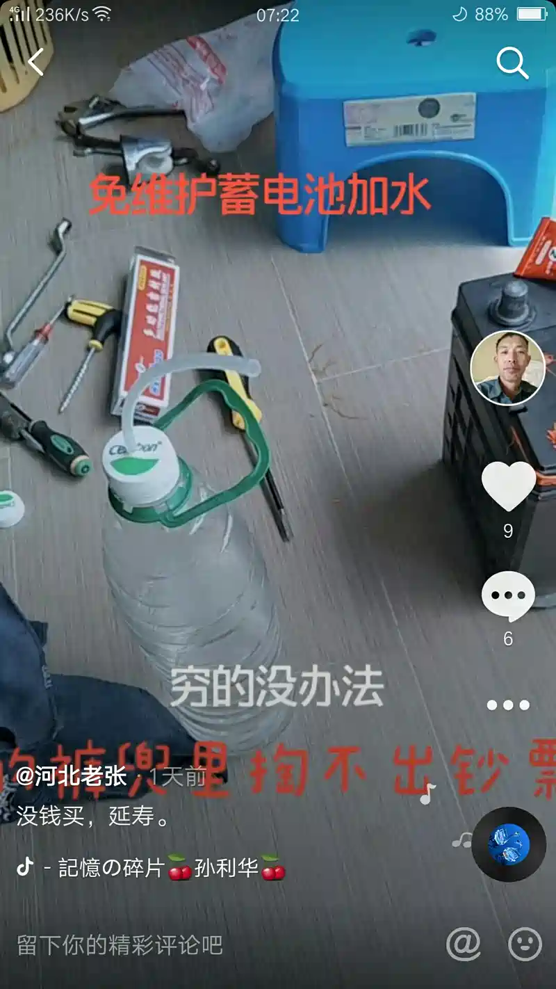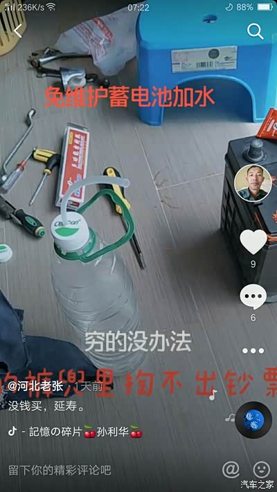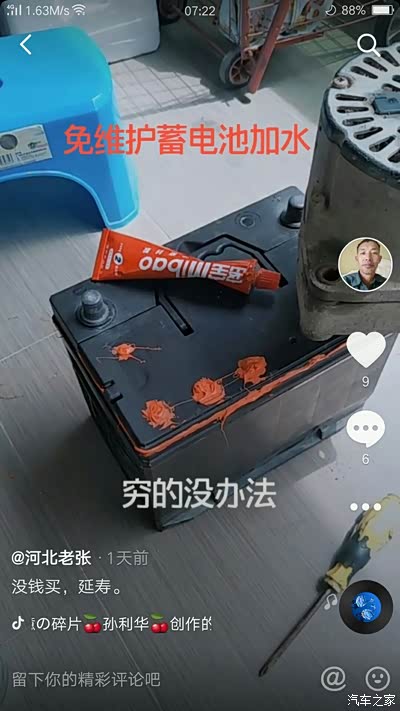 前几天无意看一下电瓶检查孔,没有绿色了。黑咕隆咚的。我当时感觉麻烦了,心想,好不好亏电。遂上车启动,还好一下子就打着了。我想能不能检查一下。@河北老张:开盖不好搞,撬变形了,后来干脆钻孔。加好水,直接封好。5年的瓦尔塔延寿一年。看看行不行。明年再做一个视频给老铁看看。变形的位置抹好胶,用发电机压着。等胶干了再扯下。