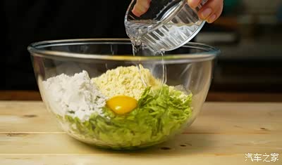 榆钱中加入鸡蛋、面粉、玉米粉和盐,搅拌均匀,然后再倒一些水,拌匀