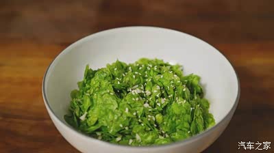 待榆钱稍稍晾凉后,倒入蒜蓉、盐、醋和香油,拌匀后再撒上芝麻,就可以吃了