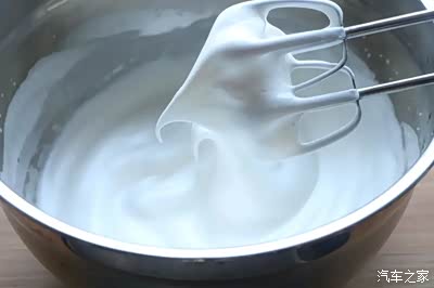 6、用电动打蛋器打发,打发过程中分2-3次加入白砂糖,打至提起打蛋器有小弯钩的状态即可停止打发;