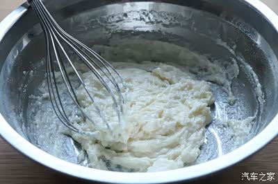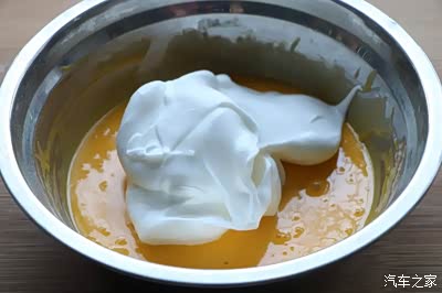 7、然后把蛋白霜先分1/3到蛋黄糊里,翻拌均匀;切不可用画圆的手法拌;