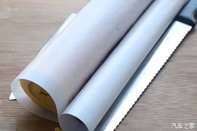 13、定型之后,再把油纸轻轻撕掉,切成大小一致的蛋糕卷即可;