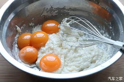 3、再把鸡蛋的蛋清和蛋黄分离,蛋黄加在面粉糊里;