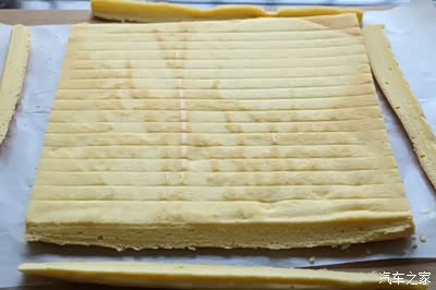 11、烤好的蛋糕放在烤架上面,凉至手温的温度,垫上油纸倒扣在烤架上面,撕掉底部的油纸,把四边不规整的部分切掉,左右直切,前后斜刀45度切;