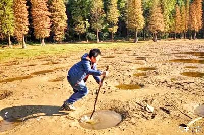 黄婆洞水库边上部分已干涸,形成一个个小小的坑洼之地,小朋友看到就开心地找到树枝玩起跳坑坑的游戏。