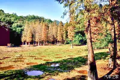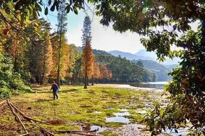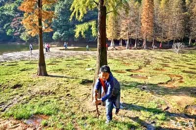 在黄婆洞水库的水杉有已经淡黄转棕的变化,小朋友就喜欢在水库旁嬉戏。