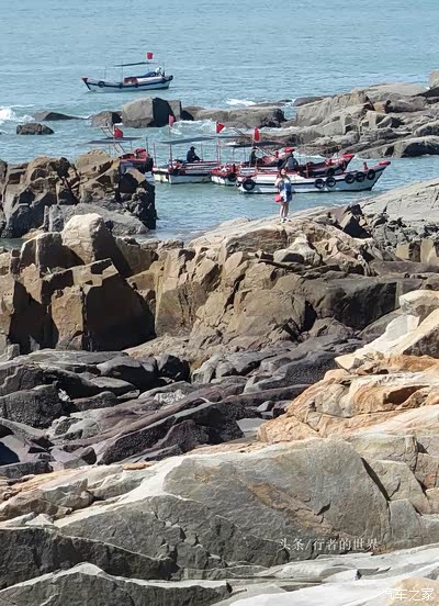 走在连绵的礁石海岸,各色礁石形状各异,在波浪的冲击、掏蚀下嶙峋的礁石、海蚀洞穴满是岁月沧桑。礁石堆里杂草丛生,近海处石滩上爬满不知名的贝壳类。一望无际的茫茫海天,偶见有渔船划过水面,成群的白鹭在绕船盘旋。