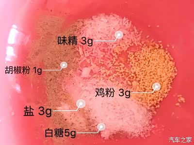 【调制粉料】以500g猪肉为例,准备3g味精,鸡粉3g,胡椒粉1g,白糖5g3g大约是我们普通调味勺的大半勺 👉🏻盐最好不放在一起,拌馅时单独放