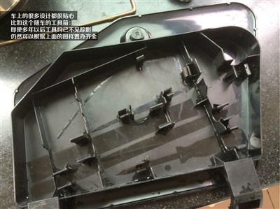 车上的很多设计都很贴心,比如这个随车的工具箱:即使多年以后工具均已不见踪影,仍然可以根据上面的图样置办齐全。