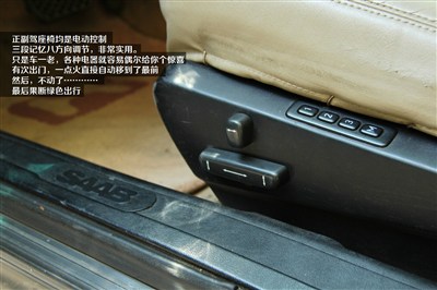 正副驾座椅均是电动控制 ,三段记忆八方向调节,非常实用。只是车一老,各种电器就容易偶尔给你个惊喜。有次出门,一点火直接自动移到了最前。然后,不动了…………