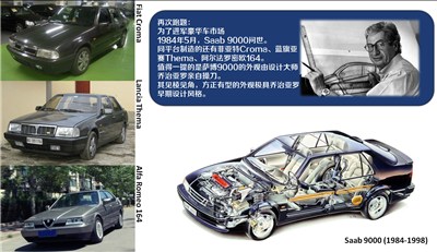 再次跑题: 为了进军豪华车市场1984年5月,Saab 9000问世。同平台制造的还有菲特Croma、蓝旗亚赛Thema、阿尔法罗密欧164。值得一提的是萨博9000的外观由设计大师乔治亚罗亲自操刀。其见棱见角,方正有型的外观极具乔治亚罗早期设计风格。