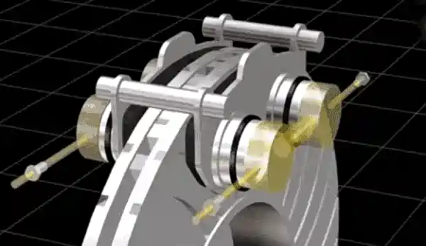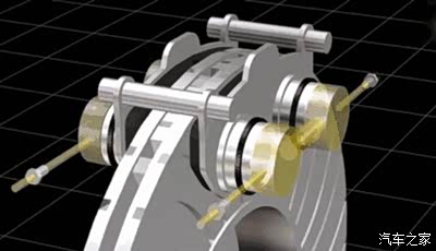 与鼓式制动不同,盘式制动的旋转元件是刹车盘,与其摩擦的变为了制动钳。当车辆需要制动时,制动钳被液压力推动,上面的摩擦材料(制动衬块)夹住转动的刹车盘。这个过程十分类似于我们自行车的制动过程。