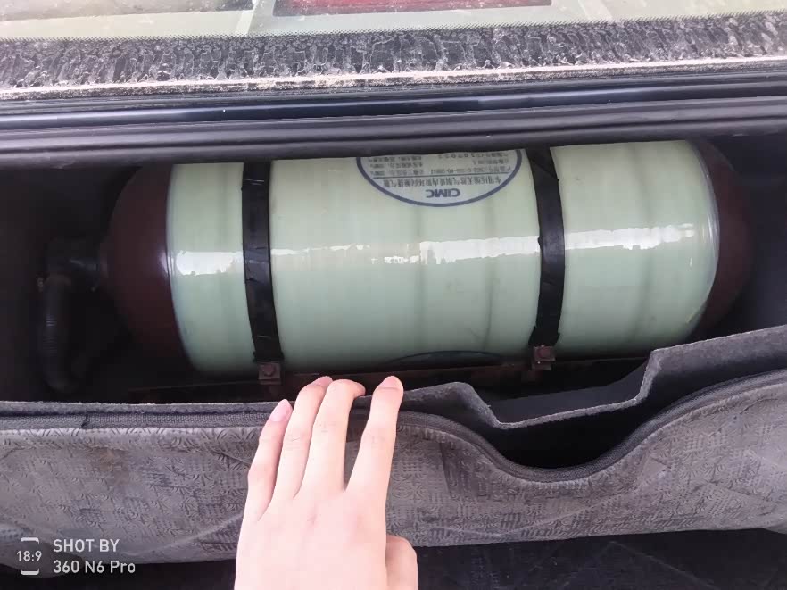 后备箱,就很不舒服了。拖着个80的罐子200斤。固定罐子的支架也是临时焊接的。小作坊的产物。改装厂降低成本角钢焊接的。固定打孔也注意一下四个孔尽量让用钻孔器开口。别***的用铁锥子用锤子砸孔。我就是砸