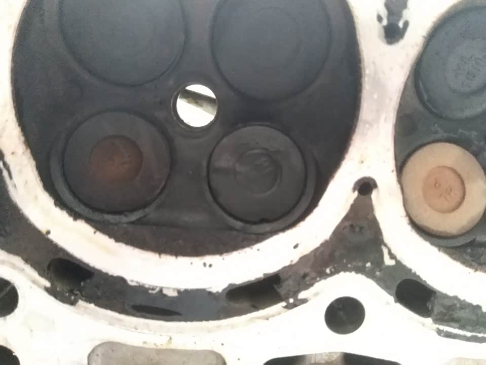 拆开发动机近照可以看见这个缸已经不工作了黑球球的。气门有缺口。