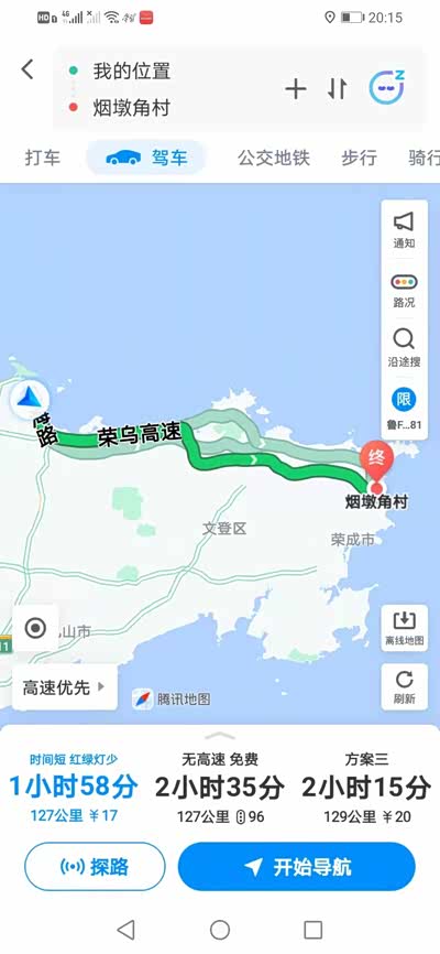 出发前通过腾讯地图做了路线策划,选定一条行程和耗时都相对较短的线路,既包括高速路,也有国道、省道和县道,看着线路复杂可运用导航基本没什么问题,这在前些年拿着纸质地图像当年打仗那样勾画线路真是无法比较。2021年2月19日(初八),上午驾车离开家,一路上听着林志玲那悦耳的娃娃音做导航提示,感觉是种享受。此外,女儿自学会开车以来,都是在城市街道和高速路上练车,还没有在乡村街道和农村公路上练过车,也想让她在这条线路上驾车试试手,可是,遇到二次险情吓出一身汗来,一次是在文登的乡镇街道上正常行驶,从右侧小路上突然窜出一辆黑车毫不顾忌我们这辆正常直行的车,由于刹车及时才没有造成车祸。另一次是乡村公路由于突然变窄而没有发现提示,车行驶到跟前才发现差点冲出路面造成险情,总结下来就是城市的人们开车还是比较规矩能够遵守交通规则,而且,街道路况都整齐简单。
