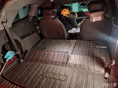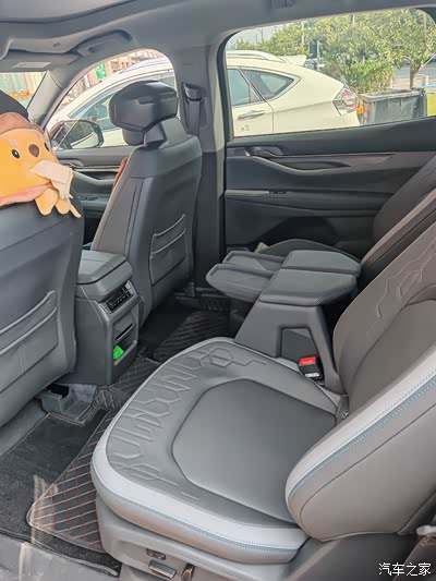 第二排,航空座椅,前后可以移动,真舒服。像是MPV的待遇,不过驾驶员是捞不着坐了。这是二排座椅往前调整的位置,宽度也足够了,是为了第三排放倒,拉东西。即使二排到最前了,宽度也足够了,第三排是真第三排,长度足够,就是高度一般,但是也比大多数的SUV强好多好多好多。如果第三排不怎用,可以把第二排使劲往后。第三排已放倒,有点乱,后面展示。