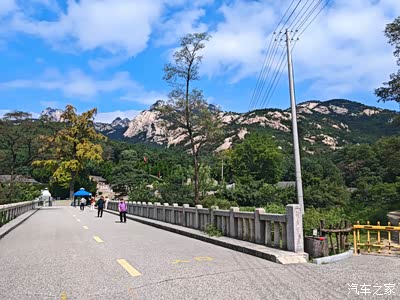 过了售票处,就是这个桥,桥尽头的蓝色遮阳伞就是检票处,桥右侧入口,左侧是出口。山顶就是昆嵛山,大大小小好多山峰,在这应该看不到昆嵛山的主峰泰礴顶,泰礴顶因为生态保护,有缓冲区,现在不让登山主峰了。之前从牟平昆嵛山泰礴顶景区爬到了泰礴顶,现在泰礴顶景区范围缩小改为昆嵛山石门里景区了。