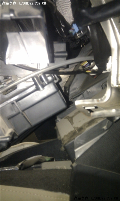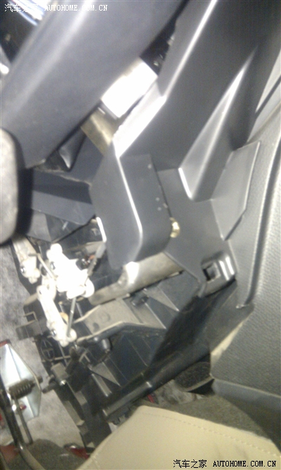 这是方向盘下面,把手机伸到里面照的,看到最右面的弯下来的金属块了么,图右面中间弯下来有豁口的地方是车辆电脑检测接口的位置,一定要把电脑检测接口从固定位置给拔下来,要不手伸不进去
