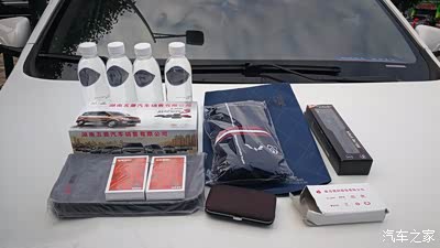 签到时公司发放的礼品,有洗车毛巾、自拍杆、指甲美容套装、扑克、纸巾和水。