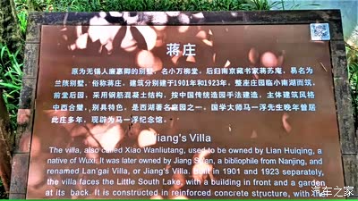 现为马一浮纪念馆,在西湖花港观鱼公园内,地处苏堤映波桥畔,濒临西南湖的蒋庄.蒋庄原名小万柳堂,原为无锡廉惠卿别墅,蒋国榜购得后改建,俗称蒋庄。庄园与苏堤之间,有一雕栏虹桥一架相通。庄园内,亭台楼阁隐现于竹木花草之间,倒映在湖光山色之中,可谓尽得西湖风流。