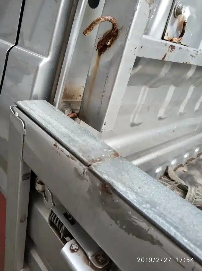 货箱窄边上都加焊了角铁,是农村电网改造剩下的,尺寸刚好,非常厚重,两年了,运货都没伤到货箱主体!