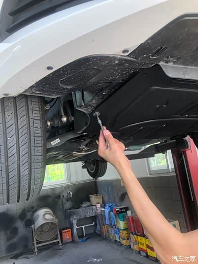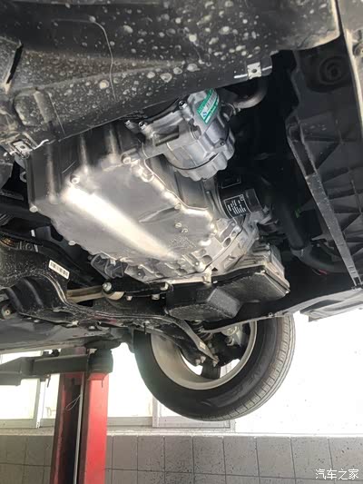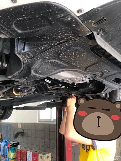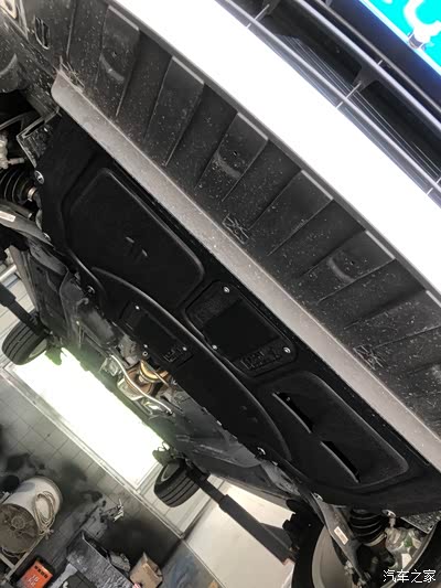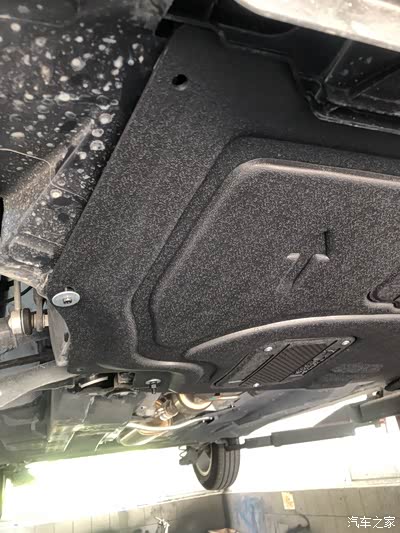 把车升起来,第一次看到晶锐的底部,原装的护板是一个类似半弧形的塑料板,比较软,薄