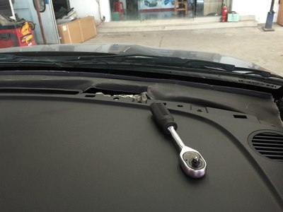 这个师傅在松右气囊上面的螺丝,倒挂金钩式作业,我也没法拍里面了:(,气囊螺丝取掉后,仪表台前端玻璃下面还有八颗螺丝要取掉,上上上一张带扳手的图片就是同步取掉了8颗螺丝。