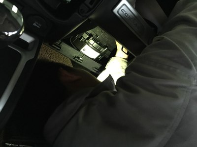 下面开始拆仪表台了,先把手套箱取下来,手套箱两边用手往中间挤就能彻底放下来,然后往上一拉就下来了。