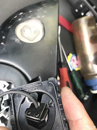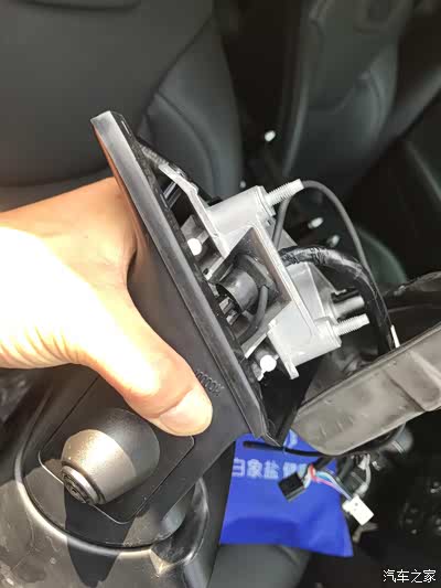 取下原车进入车内线束转接座,不用拆开插座线束,摄像头线从插座上一小孔穿入过线,再在A柱座子安装孔上锉一小缺口,这样不会卡到摄像头线束,复位,完美进入驾驶仓。