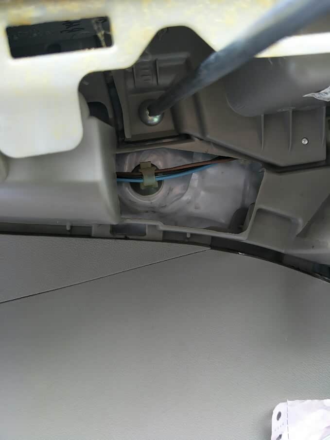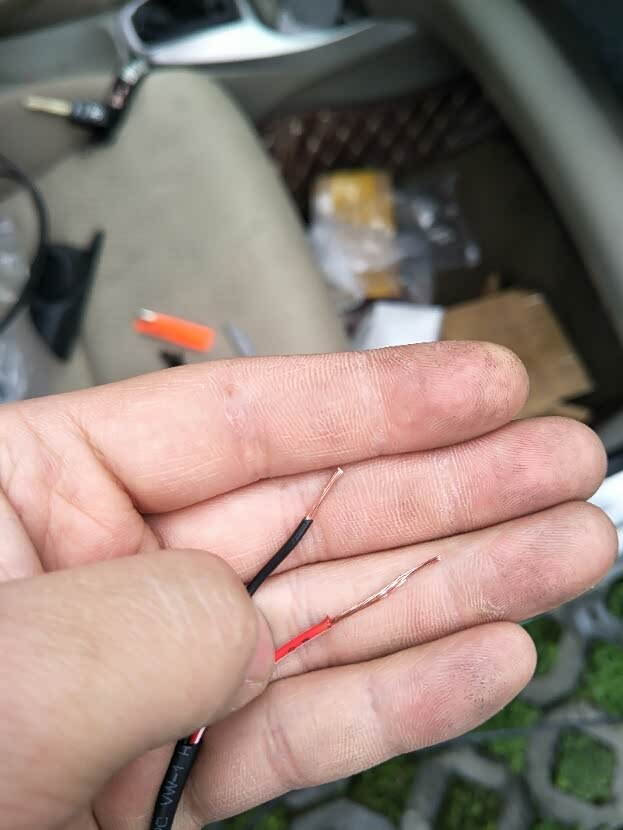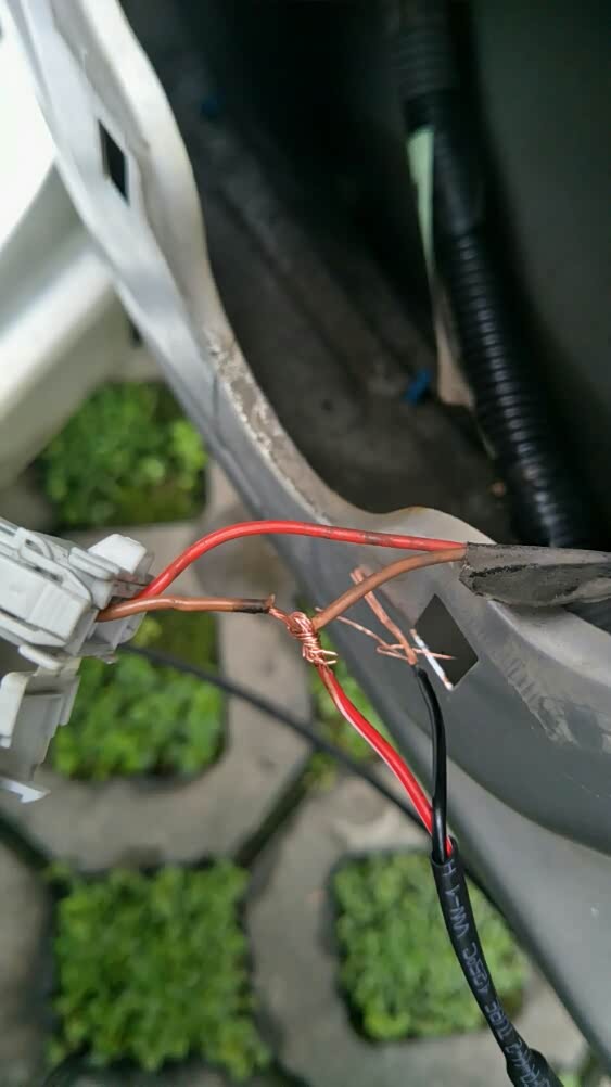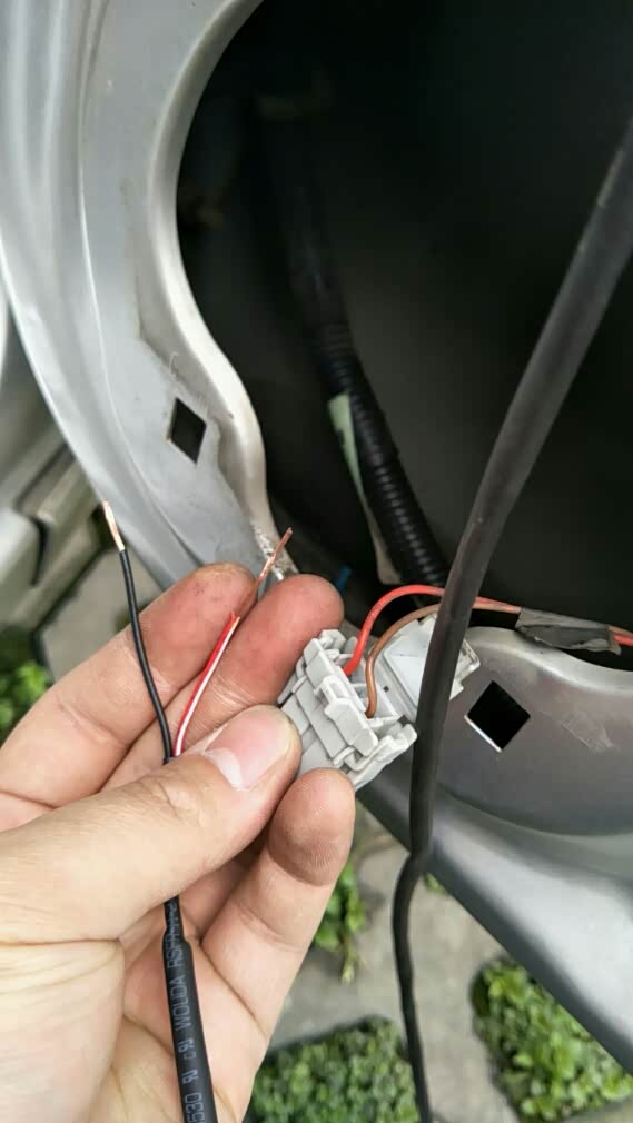 只需要漏一小段铜芯就可以了,副驾这边褐色线是正极,红色为负极,把高音头的红线接到正极上,然后裹上一段绝缘胶带,负极线也一样的做法,我的手艺有点粗糙。缠完胶带以后把插头上那个盖子盖回原位。