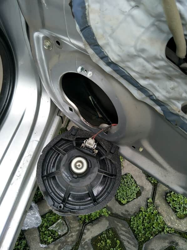 这时就把高音头和线路接上,把高音头放在它应该在的位置上还要往上一点,然后用扎丝把高音头的线和门板上不知道什么线绑在一起。