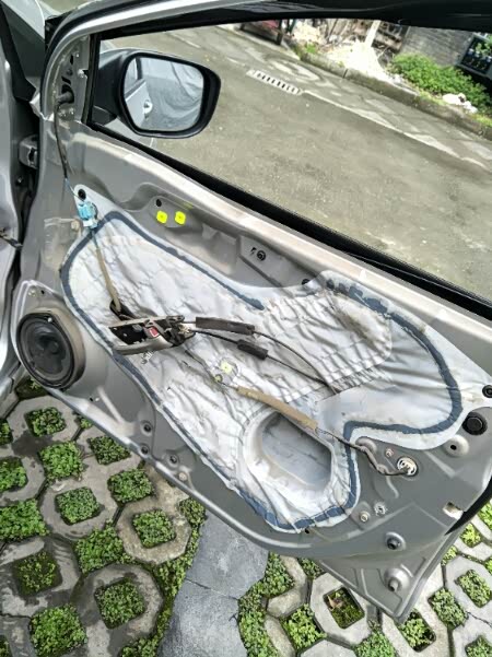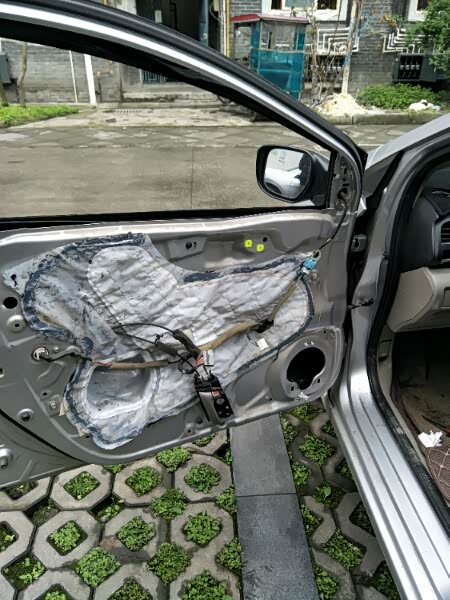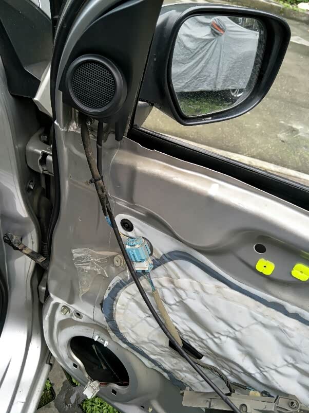 然后开始整理线束,把长的线束绕几个圈用扎丝固定在原车的线束上,注意不要把升窗器的插头绑进去了。整理完以后就可以装回门板,先把上面卡进玻璃和门板的缝隙处,然后再对着下面有卡子的一圈拳打掌击就可以还原了