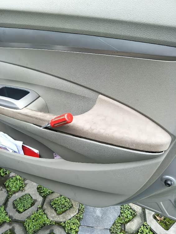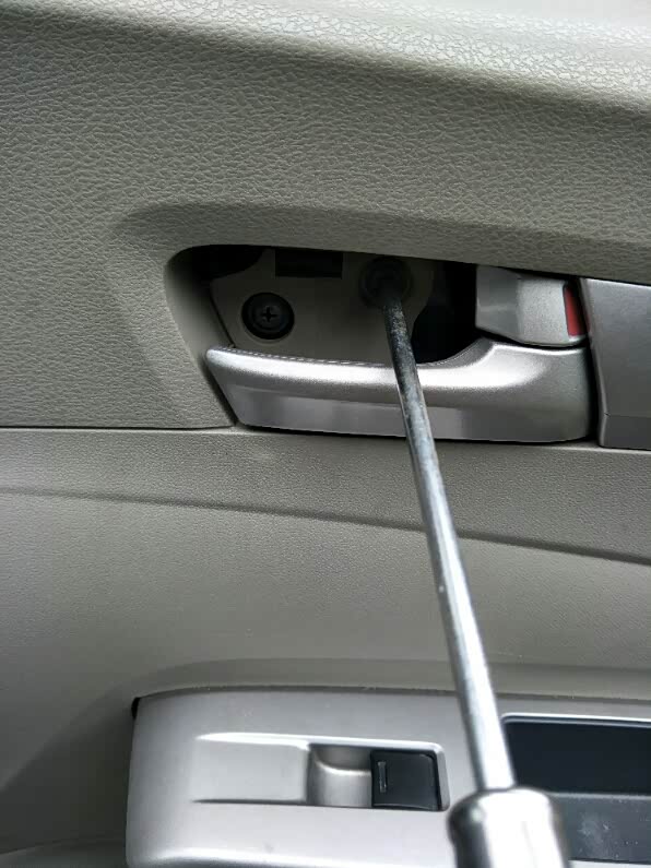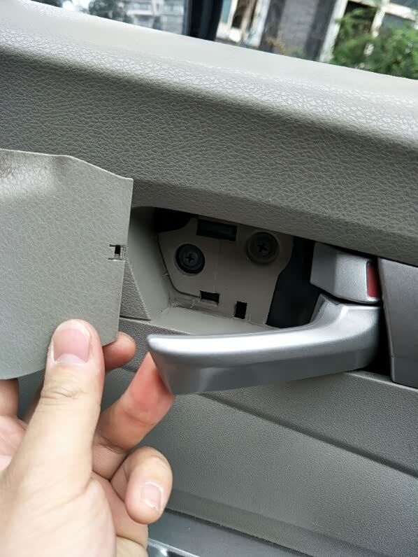 接下来开拆,我从右前门开始的,先把门把手里面的盖板取出来,用小刀尖把下面的机关网上拨住然后轻轻往外一拉就出来了。
