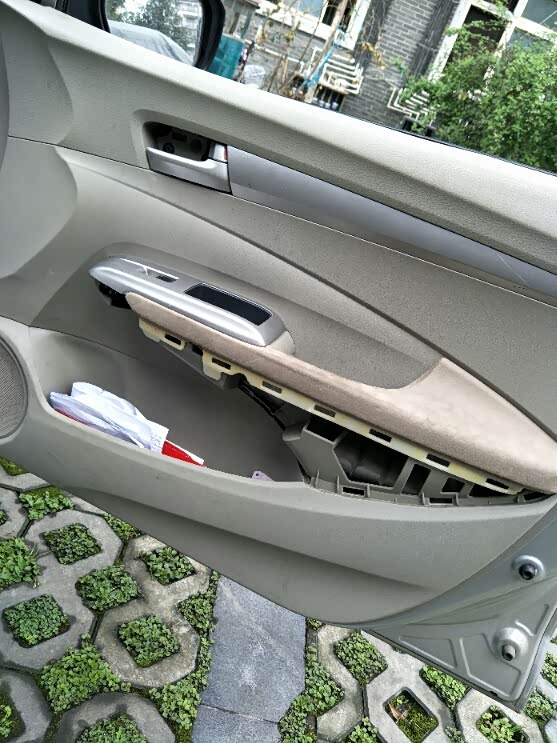 第二步拆门板扶手下面的部分,没有螺丝全是卡扣,直接从后方用撬片开始撬,我用的平口螺丝刀,撬松一个卡扣就咔一声,然后就再***下一个卡扣缝隙处继续撬,卡扣全部出来以后就能掰下来了,自己掌握好力度避免搞坏。