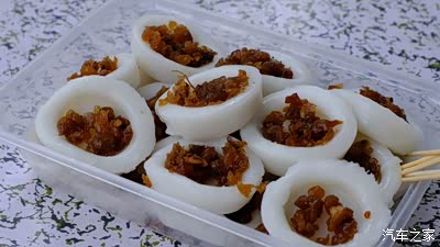“咸水粿”就是用米浆做成的小碟子般的粿皮,中间放上热乎的萝卜干,潮州当地最为地道而又便宜的小吃。在牌坊街西边的入口有一家现做现卖“咸水粿”的,特别多人排队,而且不少还是本地人。老奶奶大清早就开店,一边用炉子煮着萝卜干,一边用蒸笼热着粿皮,我也凑热闹买了一盒15元的小份。老奶奶将粿皮放进塑料盒里,数量多得铺满整个盒子,再将刚捞出来的萝卜干一点一点地放在粿皮上,一层大概有10多个吧,本以为一层就够了,结果还没完,老奶奶又来一层,小份大概30个左右吧。看上去很多,其实吃起来很少,一口一个咸水粿,粿皮无味但润滑有嚼劲,萝卜干咸甜适中,两者搭配简直绝了,我吃得停不下来,一个人差不多吃完了一份。