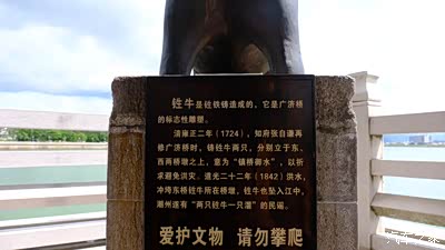 清朝雍正年间本有两只鉎铁牛分立浮桥的东西两侧,用于“镇桥御水”,而在道光时候,一场洪灾冲垮了东桥鉎牛所在的桥墩,鉎牛也随之坠入江河,所以有“二只鉎牛一只溜”的说法,而现存桥西的鉎牛依然乖乖地看守着韩江。