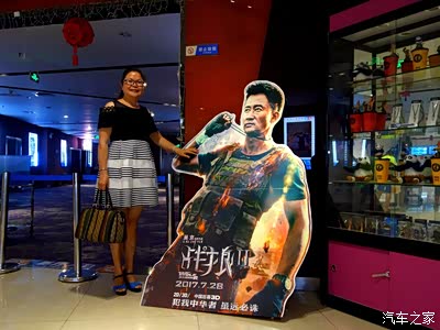 影院的入口,摆放着《战狼2》片中男主角的巨幅像,再来一张合影,爱人笑得非常开心。