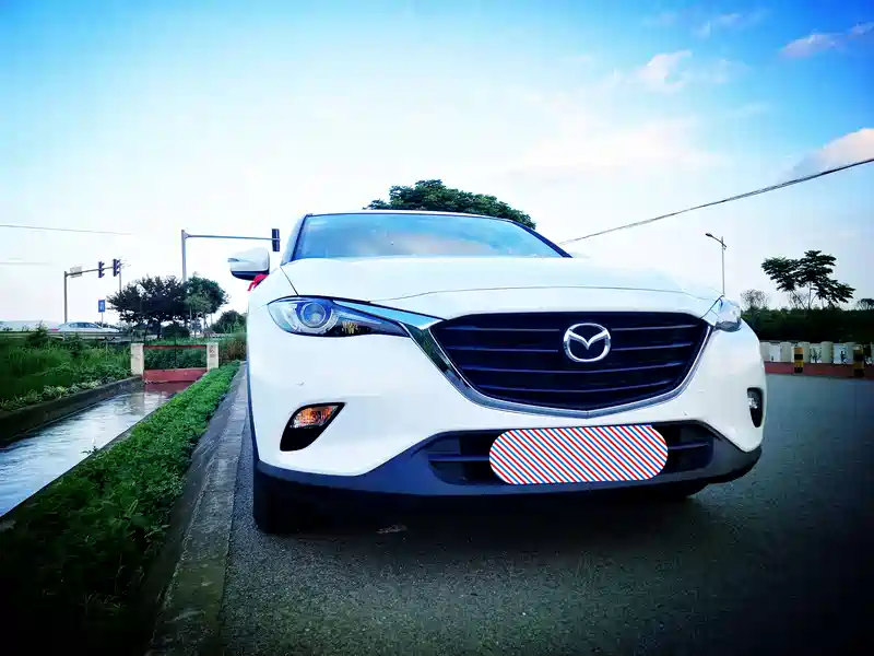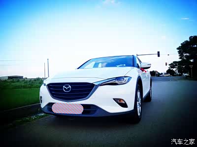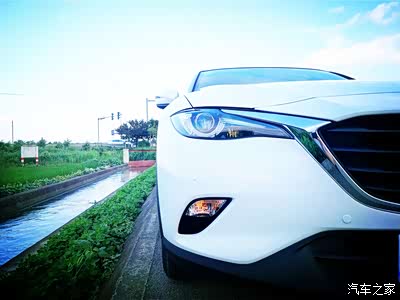 马自达的车前脸是比较锐利的那种,看起来有一种霸气感,虽然也算得上是很时尚,但是我觉得还是比较属于犀利的那一种吧。没想到在蓝天的照射之下,这样会看起来有一种很柔和的感觉。就比如说它的天蝎眼车灯吧,这样子看过去的话,居然还会觉得很迷离,可以说是相当神奇了。
