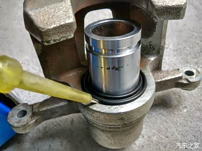 先把套好密封胶套的活塞慢慢装到卡槽位置,先把里面半圈装入卡槽,再用尖细的工具把未入槽的外面半圈耐心地顶入卡槽内,然后保持活塞垂直,用力将活塞压入油缸内到最低位置,密封胶套的内圈会自动滑入活塞的定位槽内,安装成功。