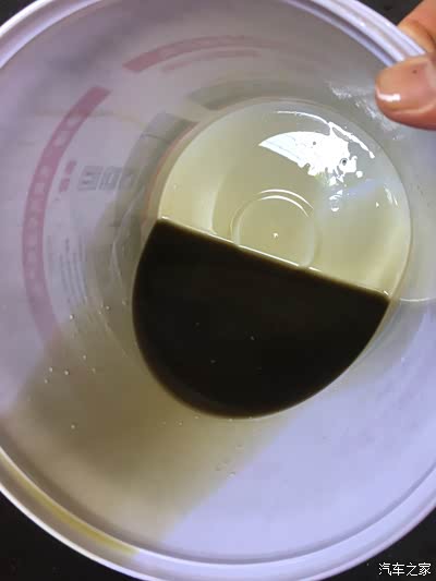 这是后桥的油,白色接油桶看起来油有点脏,放在瓶子里沉淀后其实不是很脏