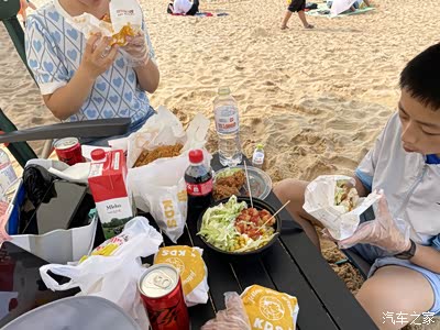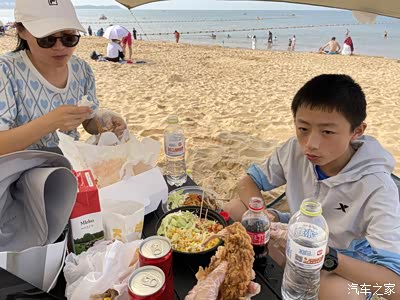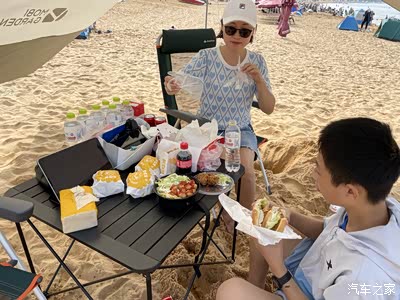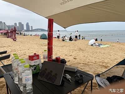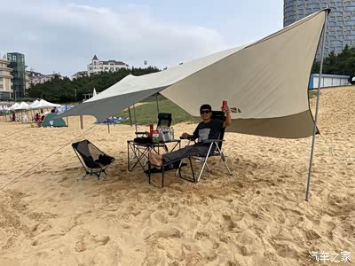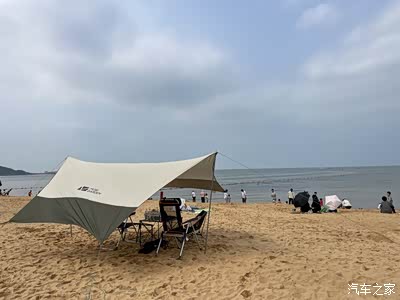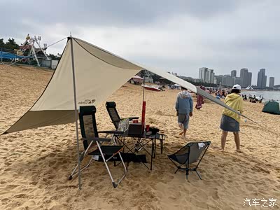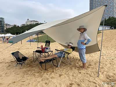 先搭建天幕,海边的紫外线可不是闹着玩的。