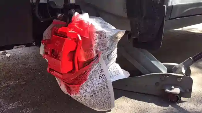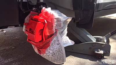 改装步骤:车轮卸下来,用纸胶带跟报纸把刹车钳以外的部分包好,用红色手喷漆喷红,要把刹车钳擦干净,