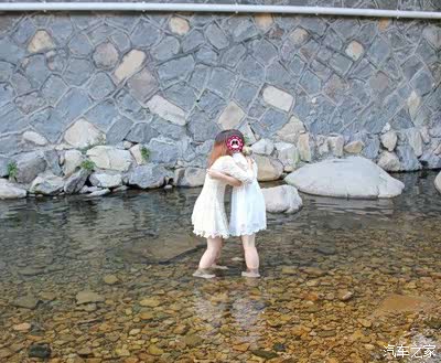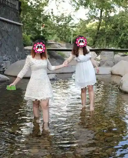 说是玩水,其实就是找了个离家很近的小水边,水质不错,都能看到水下的鹅卵石。还有这两人都没特意商量,都选了件白色的裙子,难道这就是所谓的心有灵犀?