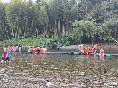 筏上的游客和岸边的游客在打水仗,虽然都不认识