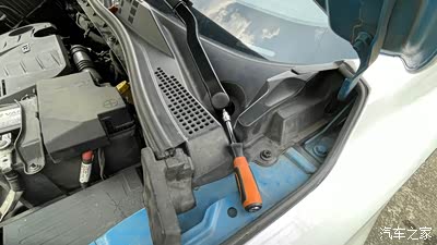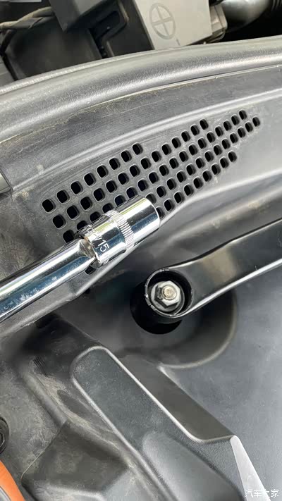 6、拆卸空调进气格栅的螺丝后,可以拉开格栅,不用拆卸下来,上面连接了玻璃水水管,拉开后不影响拆卸前减震。上图可以看出腐蚀严重。先松动螺丝就行,不用拆卸下来,把减震下面的螺丝拆卸后再来拆卸这3个螺丝。