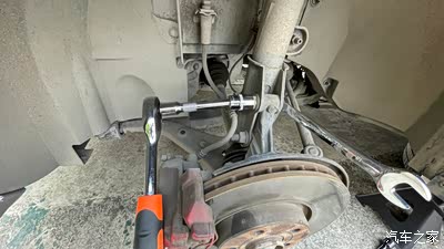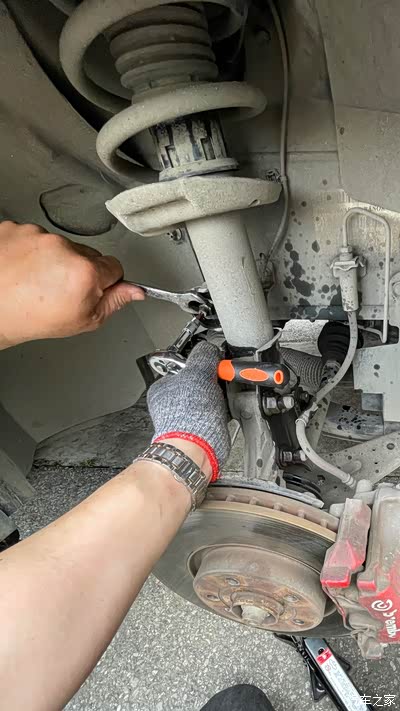 8、大力出奇迹的时候到了,使劲!取下将前减振器总成固定到前轮毂上的2个螺栓。