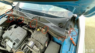 4、拆卸空调进气格栅固定到车身上的8个螺栓,这个很简单。然后就可以拉开空调格栅了,不用完全拆下来,因为那上面连接有玻璃水水管,没必要完全拆,不影响拆减震器顶部螺母的。